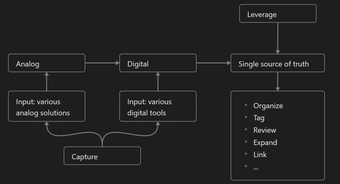 Last but not least, the Learning System feeds daily notes and leverages the knowledge base that expands over time and generates compounding returns thanks to an Idea Capture System that can be visualized as follows: