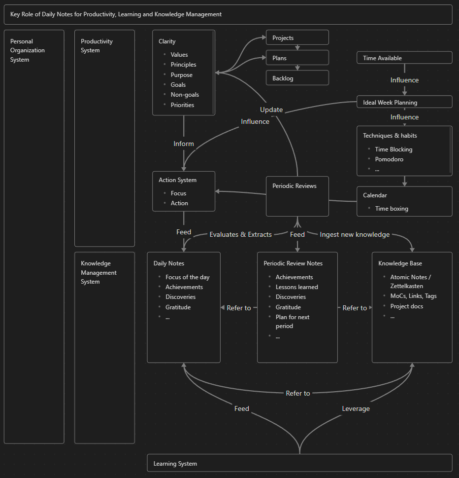 The key elements in the diagram are the daily notes and the periodic reviews. That is where the actions to realize are ultimately stored to help focus on achieving what matters. That is also where the output is stored: new knowledge, achievements, etc. On the other hand, the periodic reviews help review the past, adjust plans, plan ahead, but also help ingest new knowledge.