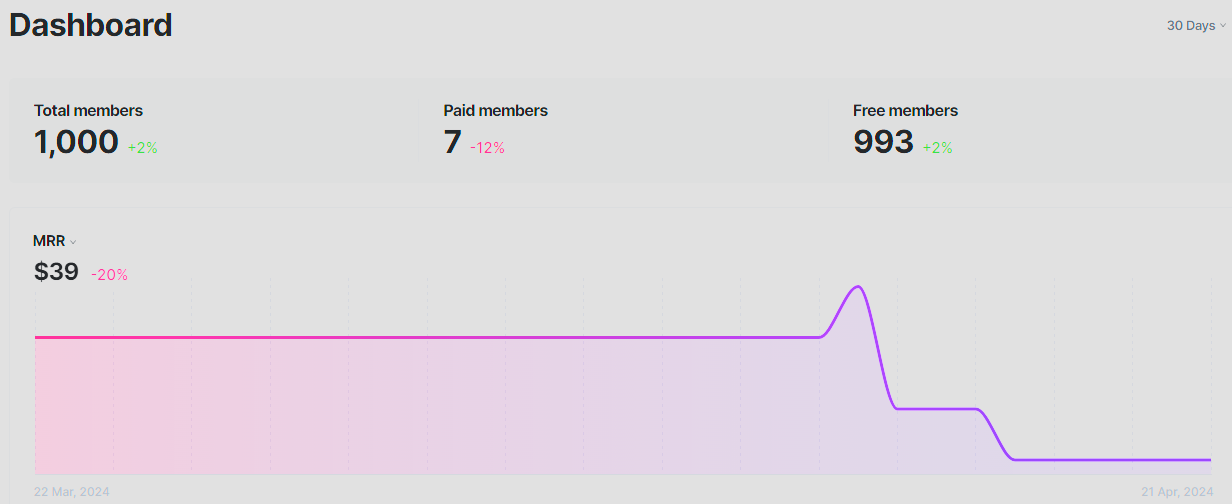 Given that Ghost costs $25/month ($300/year) for maximum 1K members, we're at the upper limit. So, we're entering the next tier (max 3K members), which costs $40/month ($480/year). I have to think about whether it makes sense for me to continue this or not, given that this is just the visible price. The rest is the time I spend to work on it all...