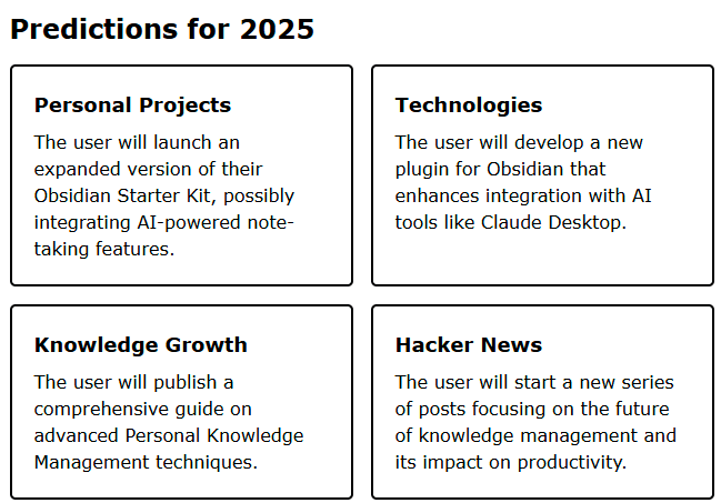I agree with most of what the tool generated for me. And it's quite impressive that it predicted that I want to expand the Obsidian Starter Kit, further leveraging AI. There's so much potential to tap into!