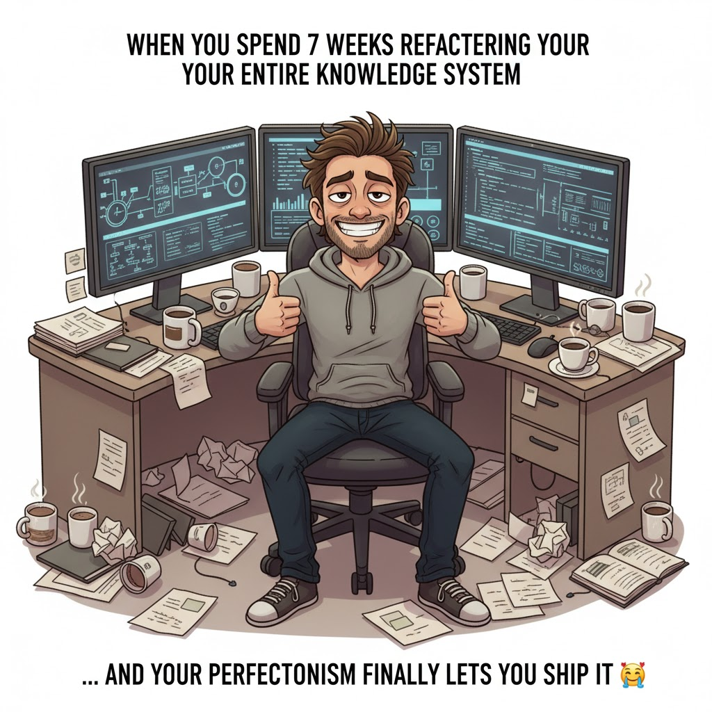 Around week 5 I was exhausted. Really exhausted. I had refactored the entire vault structure, redesigned tags, created & updated many templates, built multiple Obsidian Bases, written comprehensive docs for each system. But I still wasn't done.